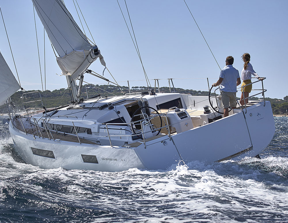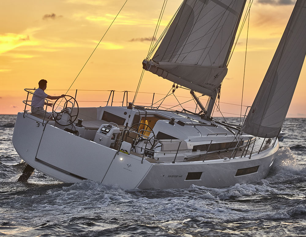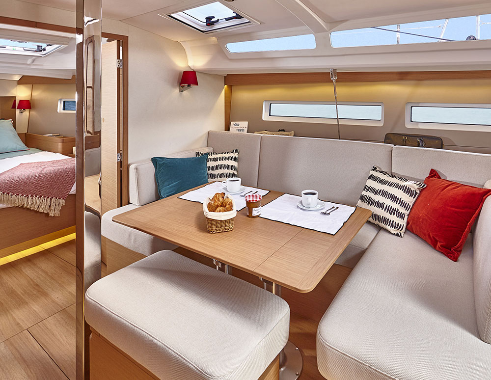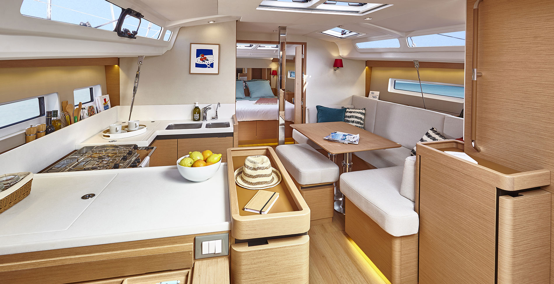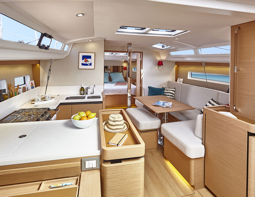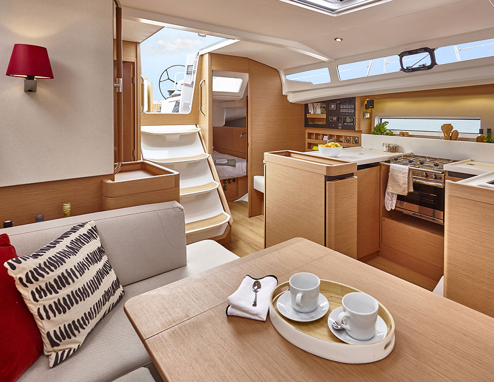 The open concept interior is bathed in light, as the main salon features a multitude of windows and hatches. The central U-shaped galley is optimally placed for comfort while under way, centralizing the weight of the appliances for optimized sailing performance, as well as serving meals in the salon. In the 440, the nav station is particularly emphasized, elevating this feature into a coffee nook or home office.