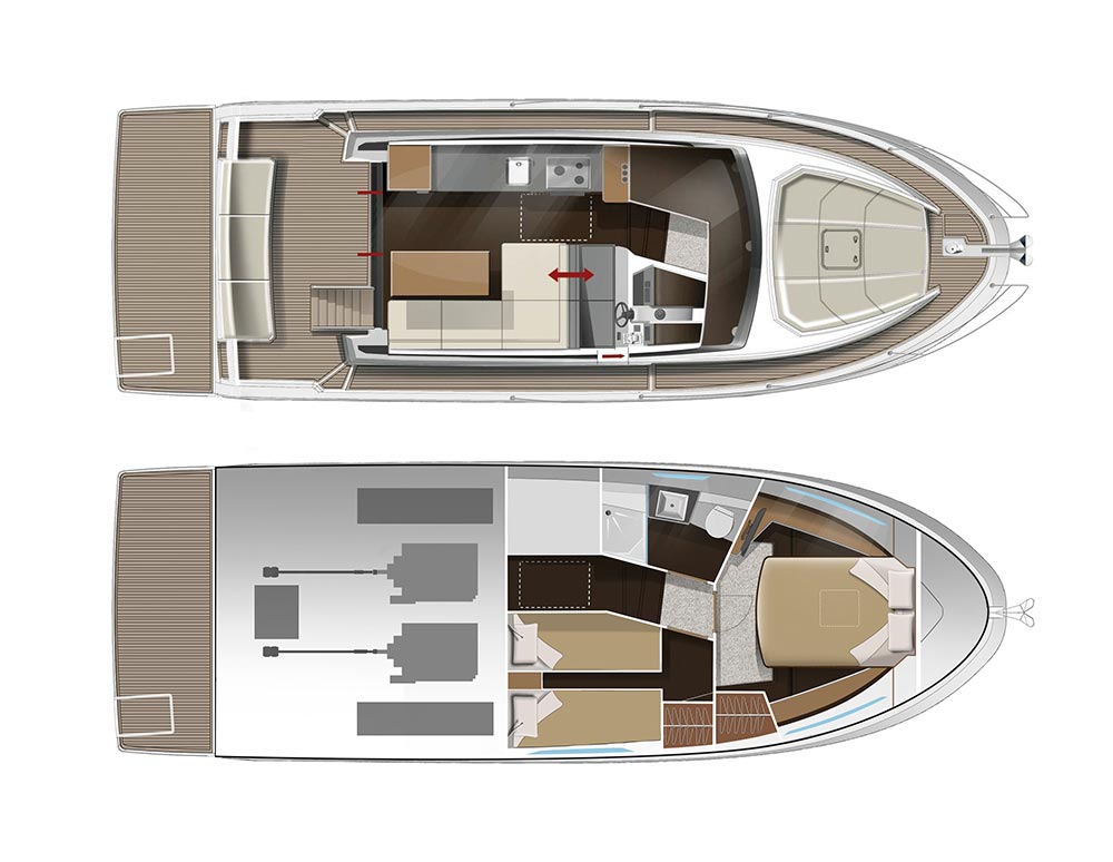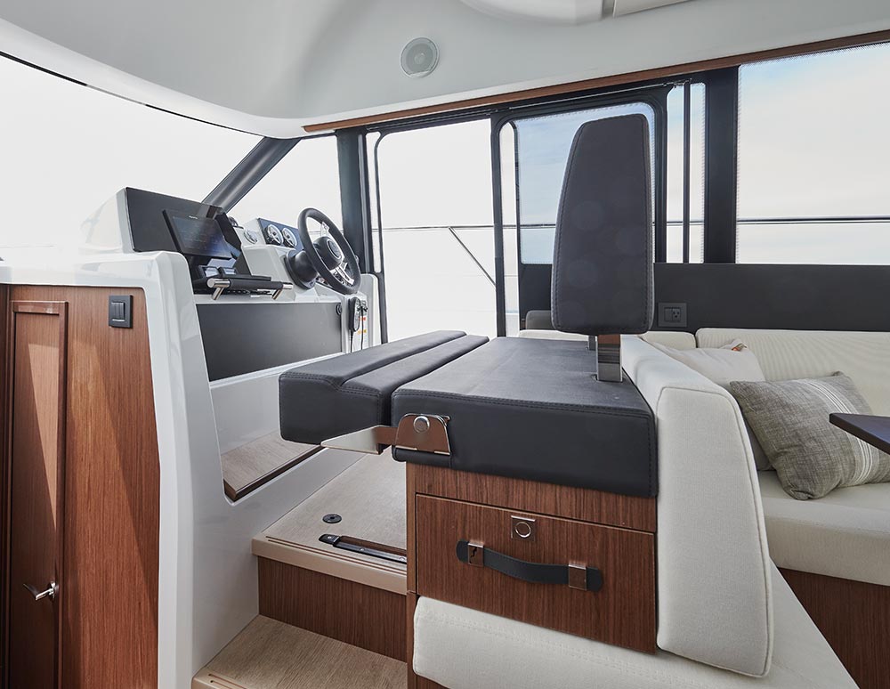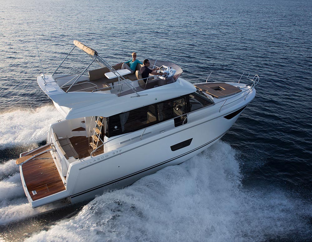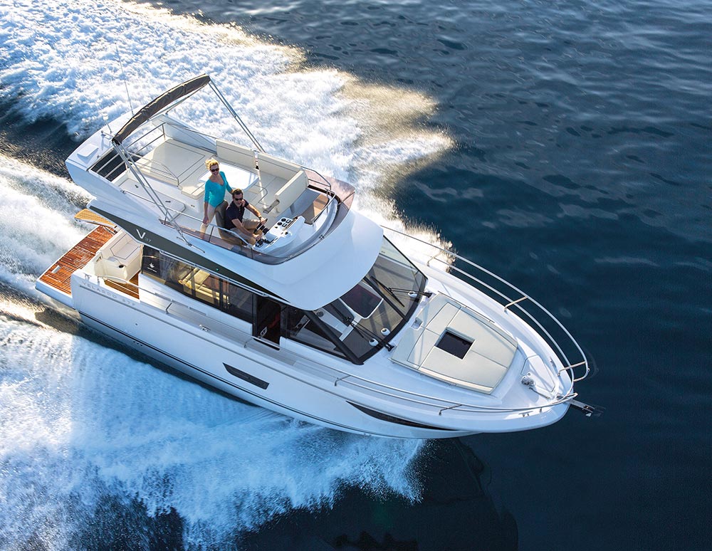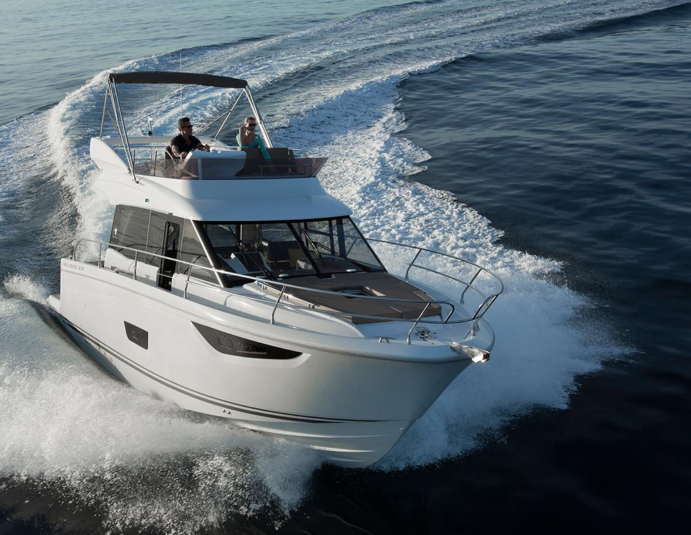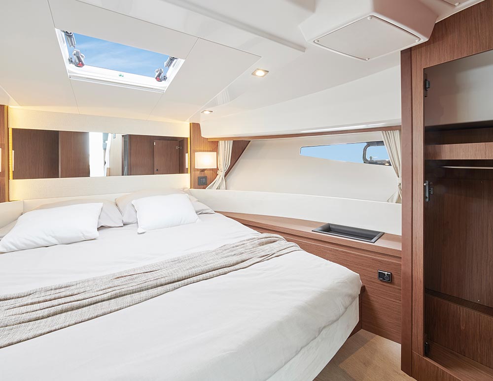This stylish European cruiser packs a surprising amount of living space in a boat of this size. A fly bridge, aft main deck seating area and sun pad on the bow for those craving the outdoors; a generous saloon, two fully enclosed cabins below and an all-electric head for your time on the inside.