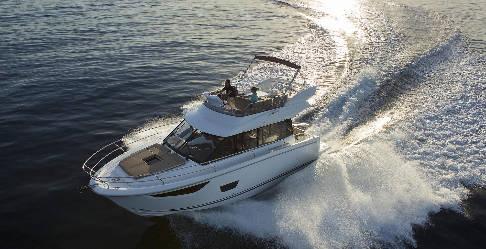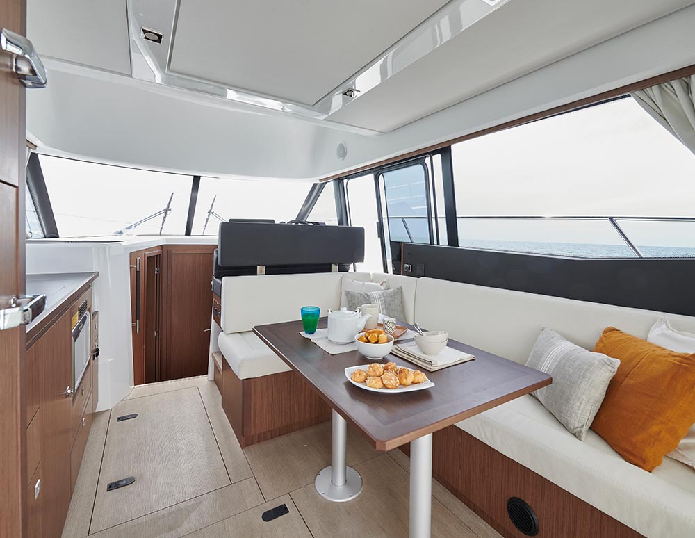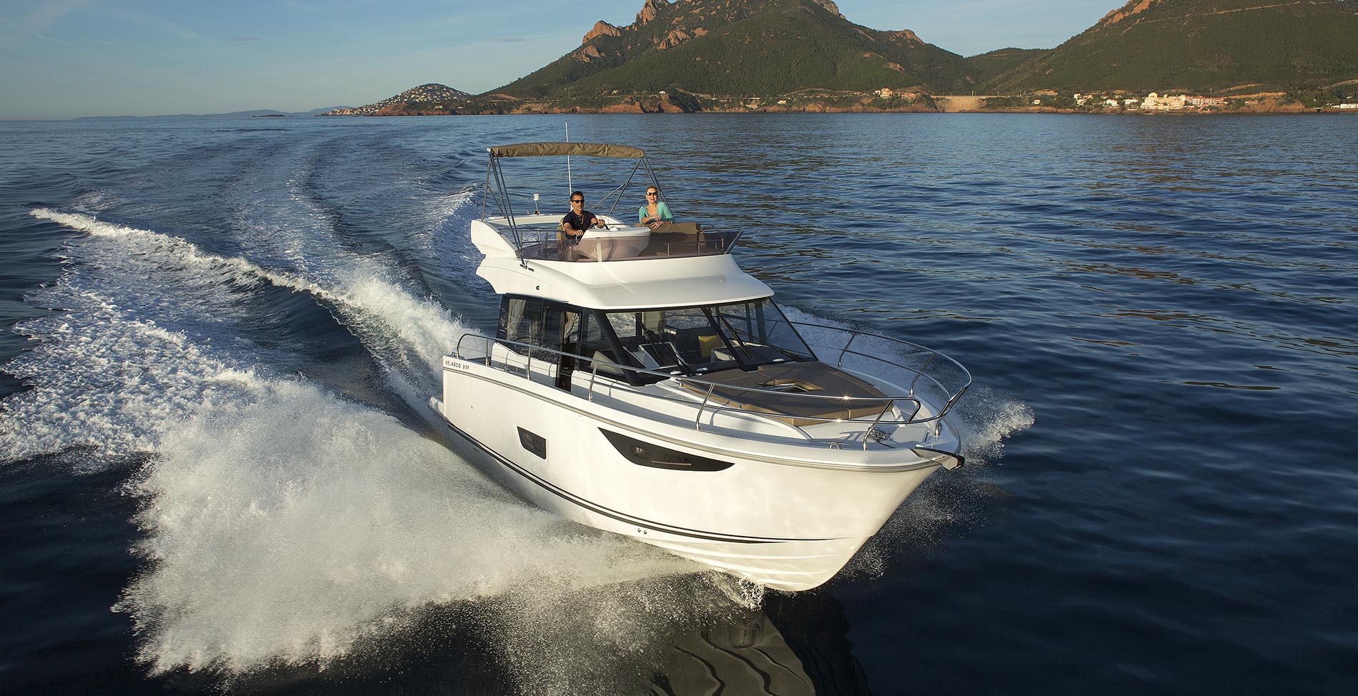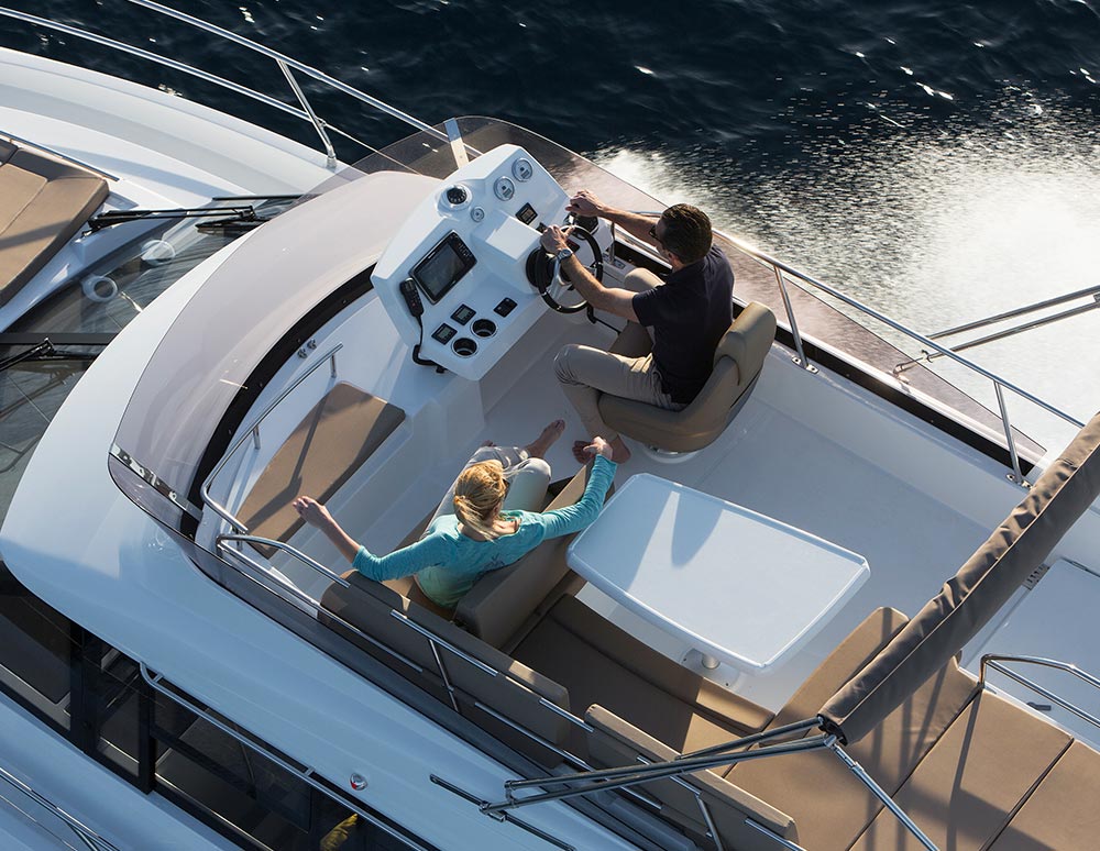 This stylish European cruiser packs a surprising amount of living space in a boat of this size. A fly bridge, aft main deck seating area and sun pad on the bow for those craving the outdoors; a generous saloon, two fully enclosed cabins below and an all-electric head for your time on the inside.